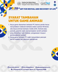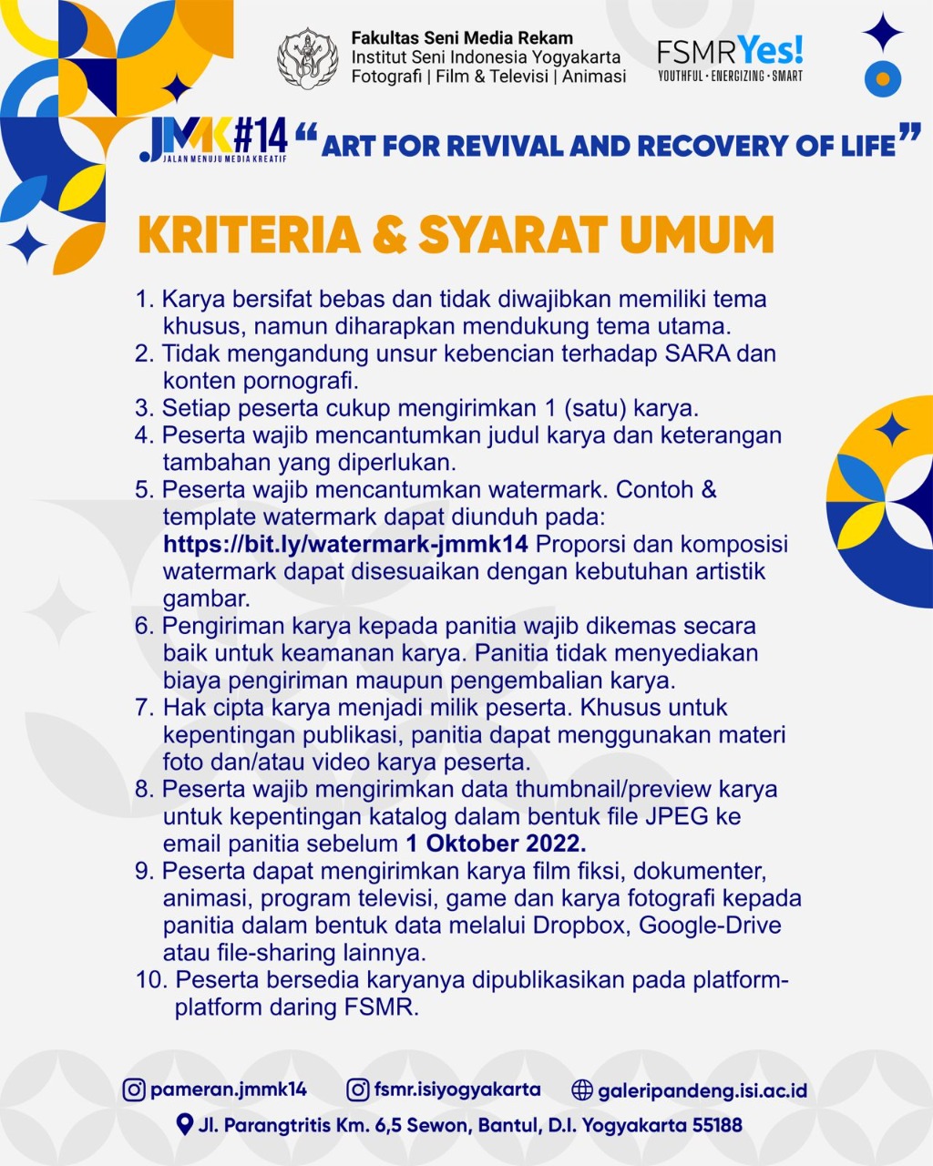 Tema pameran JMMK 14 diangkat guna membersamai semangat zaman yang dialami pada masa pasca pandemi COVID- 19. Pameran seni media rekam “Jalan Menuju Media Kreatif 14” akan dilaksanakan di Fiap Exhibition Center, Galeri Pandeng, FSMR, ISI Yogyakarta pada tanggal 25 Oktober s.d 1 November 2022. Pemilihan waktu pelaksanaan bulan Oktober sekaligus bertepatan dengan ulang tahun Fakultas Seni Media Rekam ISI Yogyakarta yang ke-29. Pameran menampilkan karya fotografi, program televisi, video-art, film dokumenter, film cerita, film animasi dan game mahasiswa dan dosen di lingkungan FSMR ISI Yogyakarta maupun karya-karya tamu yang setiap tahun selalu diundang berpartisipasi dari berbagai perguruan tinggi seni dengan program studi bidang media rekam yang tergabung dalam BKS-PTSI (Badan Koordinasi Seni Perguruan Tinggi Seni Indonesia), para kolega profesional Fakultas Seni Media Rekam, dan peserta tamu dari perguruan tinggi sejenis di luar negeri yang menjalin kerjasama dengan FSMR ISI Yogyakarta.