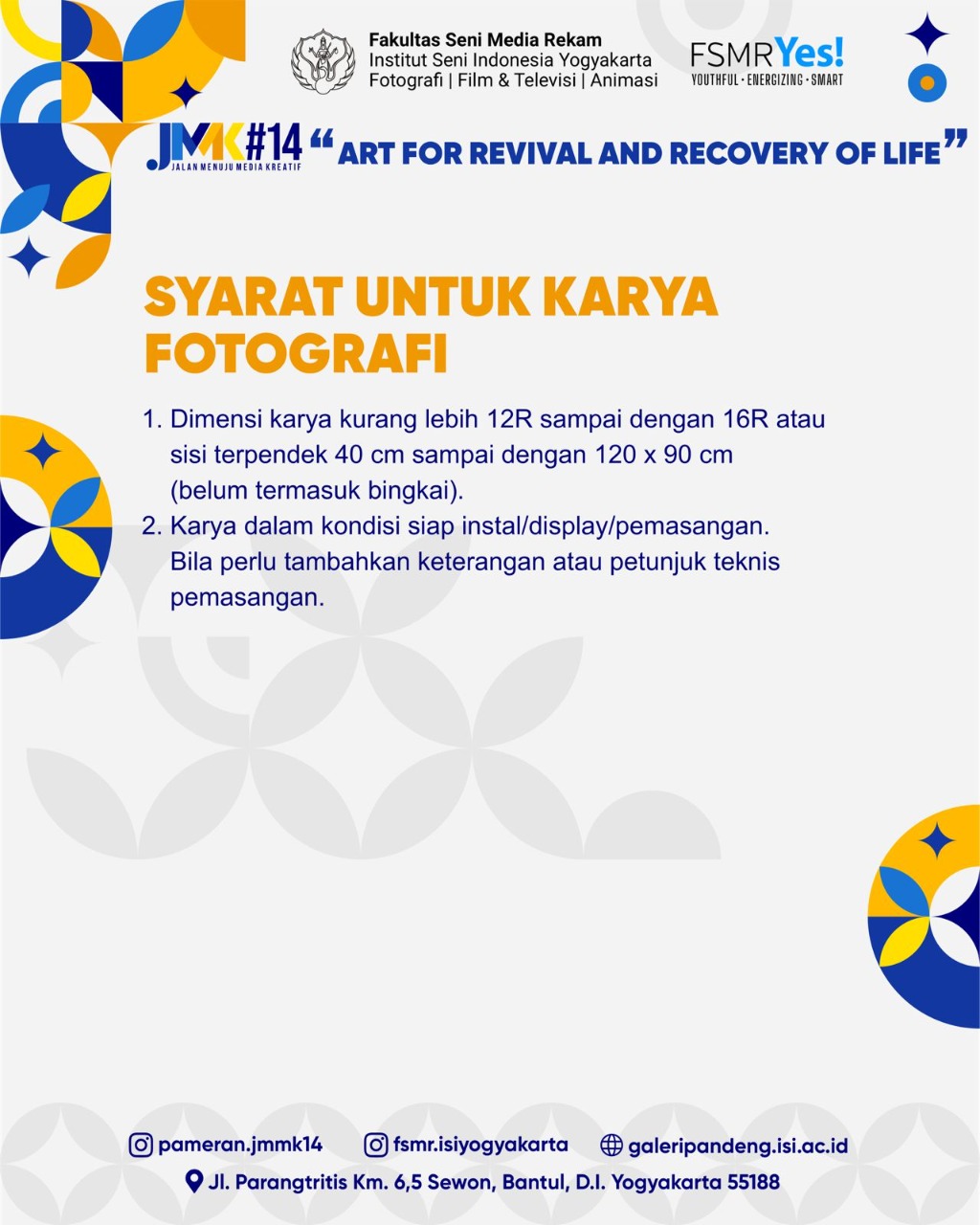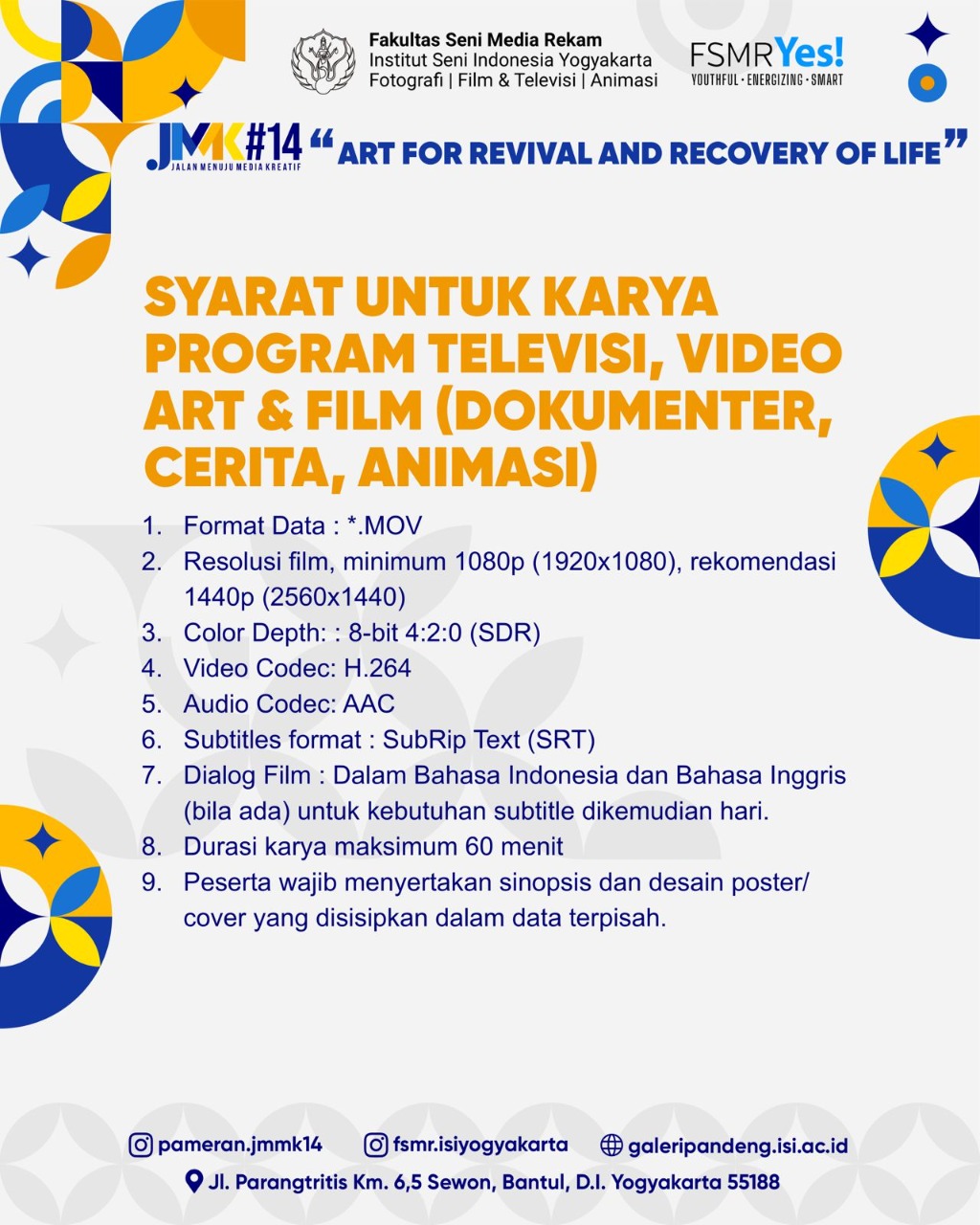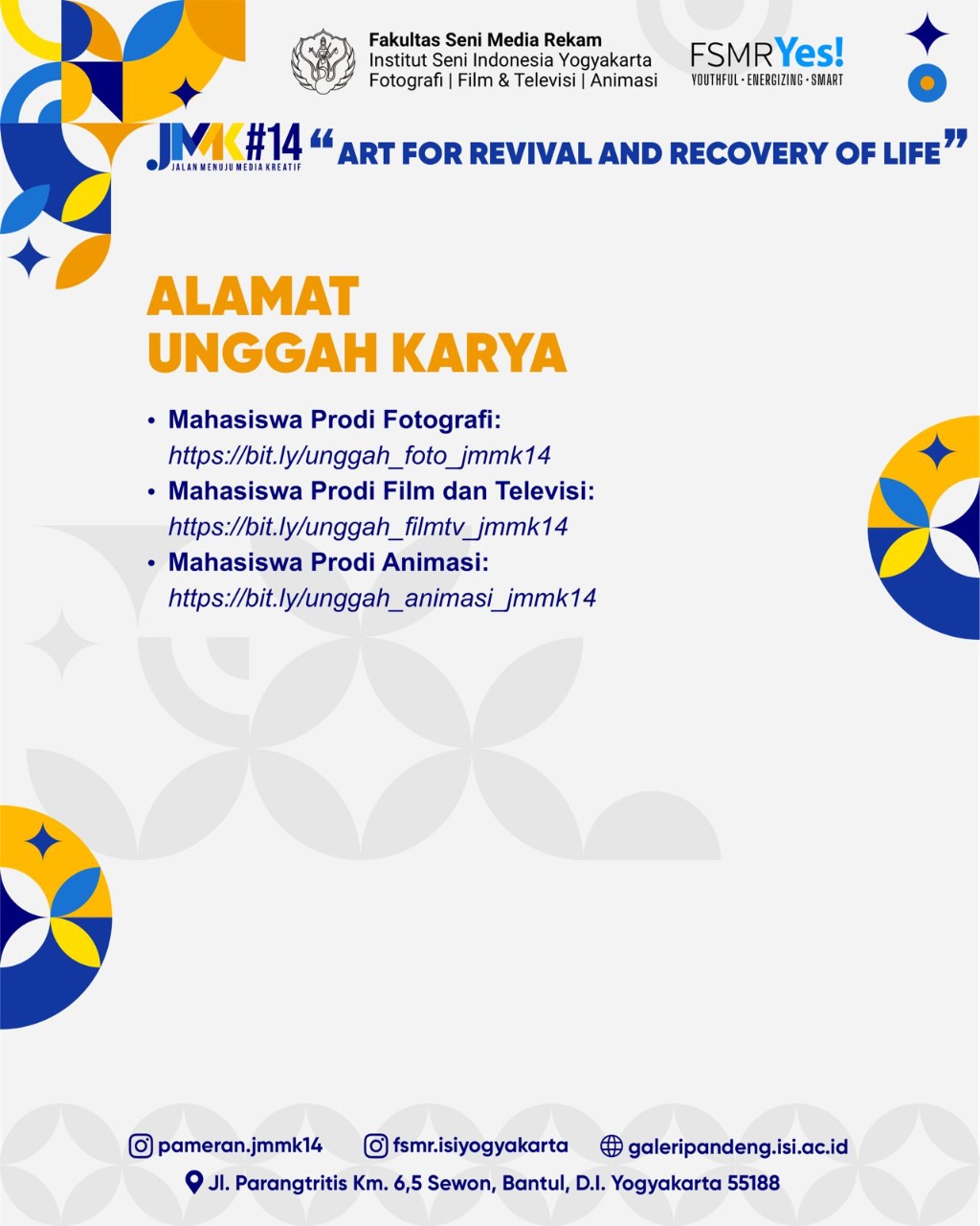 Pameran Seni Media Rekam “Jalan Menuju Media Kreatif” merupakan program tahunan yang diselenggarakan Fakultas Seni Media Rekam Institut Seni Indonesia Yogyakarta sejak tahun 2009 dan diikuti oleh mahasiswa, staf pengajar program studi Fotografi, Televisi dan Animasi FSMR ISI Yogyakarta, kolega dunia akademis, industri, para profesional dan seniman seni media rekam. Pameran ini didedikasikan kepada publik sebagai bentuk pertanggungjawaban terhadap eksistensi dan pengembangan keilmuan bidang seni media rekam khususnya fotografi, program televisi, film, animasi dan game serta sebagai indikator kualitas belajar mengajar di Fakultas Seni Media Rekam ISI Yogyakarta. Pameran tahunan seni media rekam “Jalan Menuju Media Kreatif” ke empat belas tahun 2022 ini secara khusus menyajikan tema “Aktualisasi Seni untuk Kebangkitan dan Pemulihan Kehidupan”.