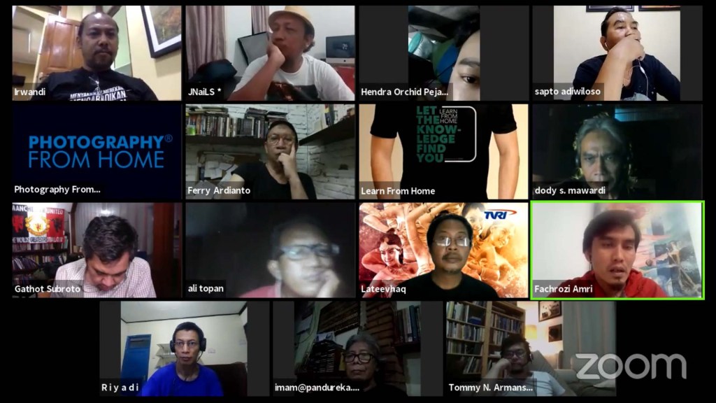 Peserta webinar mengajukan pertanyaan saat sesi dikusi webinar edisi 67 yang diselenggarakan oleh Learn From Home dengan  tema “Criticizing Photographs: Langkah Langkah Penulisan Kritik Foto” berlangsung pada Selasa (21/7). Dalam diskusi tersebut, para peserta memberikan masukan bagaimana membangun iklim dkritik foto yang baik di Indonesia.