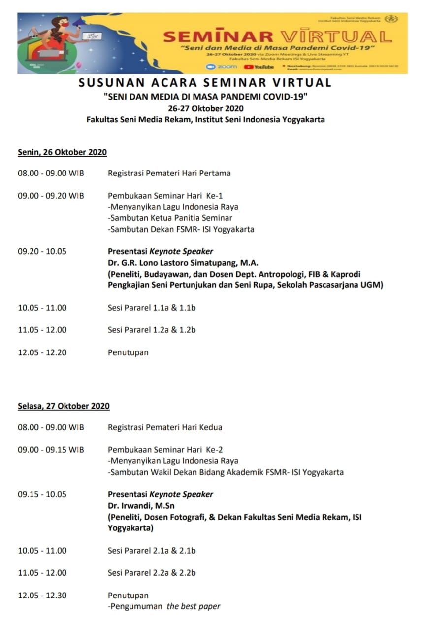 BERIKUT SUSUNAN ACARA SEMINAR VIRTUAL FSMR 2020 “SENI DAN MEDIA DI MASA PANDEMI COVID-19” FAKULTAS SENI MEDIA REKAM ISI YOGYAKARTA
