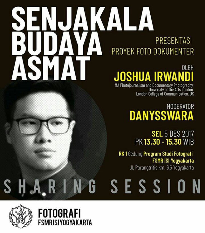 Joshua Irwandi, seorang fotografer muda berbakat dan peraih gelar MA dari Photojournalism and Documentary Photography, University of the Arts London, London College of Communication, UK., berkesempatan hadir di Program Studi Fotografi FSMR ISI Yogyakarta pada hari Selasa, tanggal 5 Desember 2017. Joshua Irwandi melakukan presentasi tentang project foto dokumenternya di Asmat, Papua. Project dokumenter ini menceritakan bagaimana media fotografi digunakan untuk membicarakan ragam pergeseran nilai yang terjadi dalam masyarakat suku Asmat. Presentasi serupa pernah dilakukan di Objectifs Centre for Photography and Film, Singapore, dengan judul Not A Blank Canvas. Joshua Irwandi juga berbagi pengalaman dirinya saat melakukan studi fotografi di Inggris dan mengikuti berbagai event fotografi di manca negara. Acara yang terbuka untuk umum ini, dihadiri sekitar 40 orang.