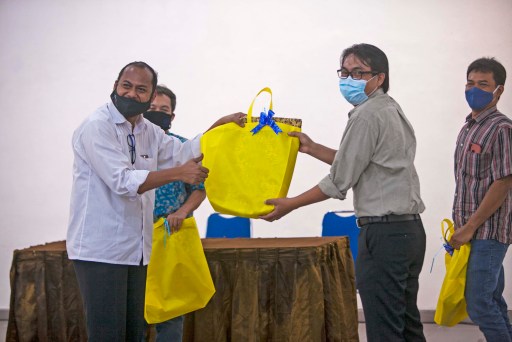 Oscar Samaratungga, S.E., M.Sn. menerima cinderamata dari Dekan FSMR Dr. Irwandi, M.Sn. saat pisah sambut pejabat lingkungan FSMR di Galeri Pandeng, Selasa (27/10). Oscar Samaratungga, S.E., M.Sn. akan memipin Jurusan Fotografi untuk masa jabatan 2020 – 2024.